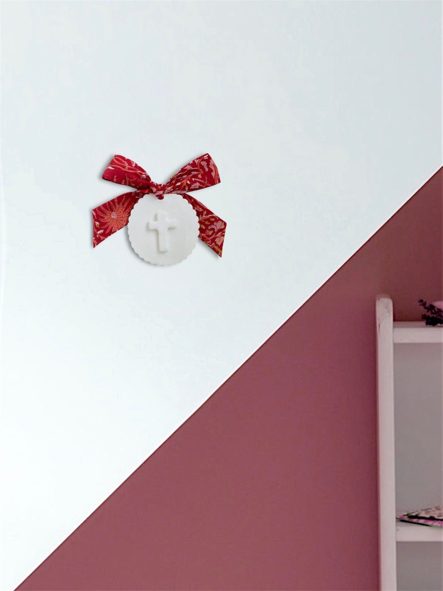 Bel ex-voto, croix enfantine, en argile blanche vernie. Orné d'un ruban en tissu indien "block-print". Idéal pour décorer les murs de votre intérieur.